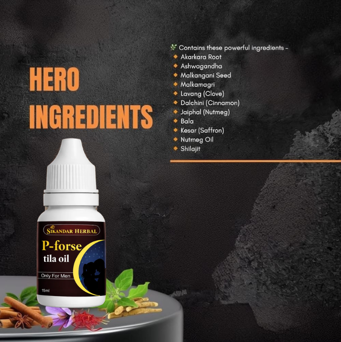 Sikandar herbal P-ForseTila Oil is a luxurious men’s wellness therapeutic oil inspired by ancient shahi formulations. Prepared with potent herbal extracts, this oil is designed to strengthen male organ tissue, improve blood circulation, increase sensitivity, support stamina, and deliver long-lasting performance when used regularly.