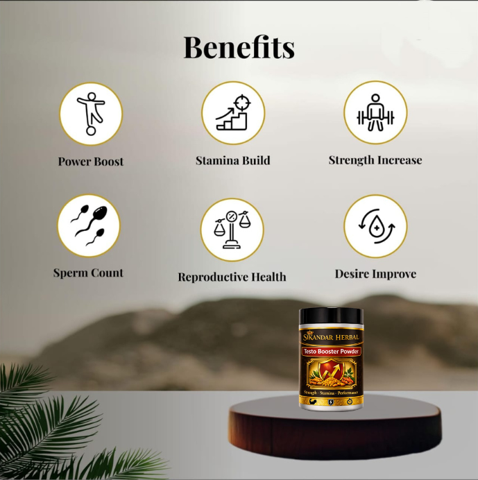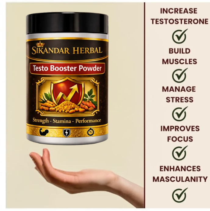 Sikandar Herbal Testo Booster Powder is a premium Ayurvedic blend made to support men’s strength, stamina, and performance naturally. Enriched with powerful herbal ingredients, it helps maintain hormonal balance and overall vitality.